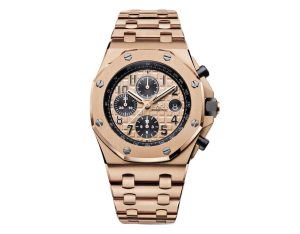 Die nächste Veröffentlichung auf der Liste ist eine weitere 41-mm-Royal Oak. Diesmal handelt es sich um einen Chronographen aus 18-karätigem Gelbgold, mit Ausnahme der Sechskantschrauben aus Weißgold in der satinierten und polierten Lünette. Das Gehäuse und das Armband erhielten das gleiche Finish wie die Lünette, ebenso wie die Krone und die Drücker des Chronographen.